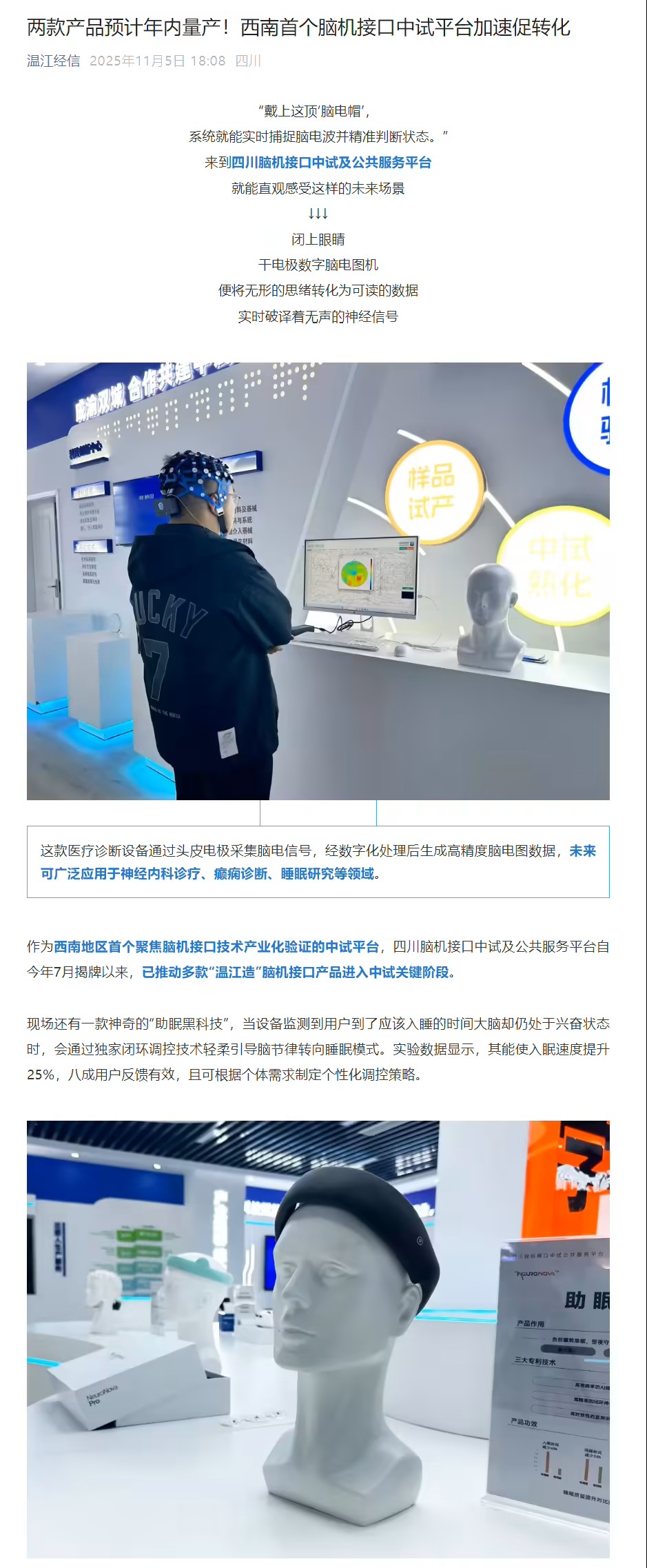 IT之家 11 月 9 日消息,据“成都发布”官方今日消息,作为西南地区首个聚焦脑机接口技术产业化验证的中试平台,四川脑机接口中试及公共服务平台自今年 7 月揭牌以来,已推动多款“温江造”脑机接口产品进入中试关键阶段。